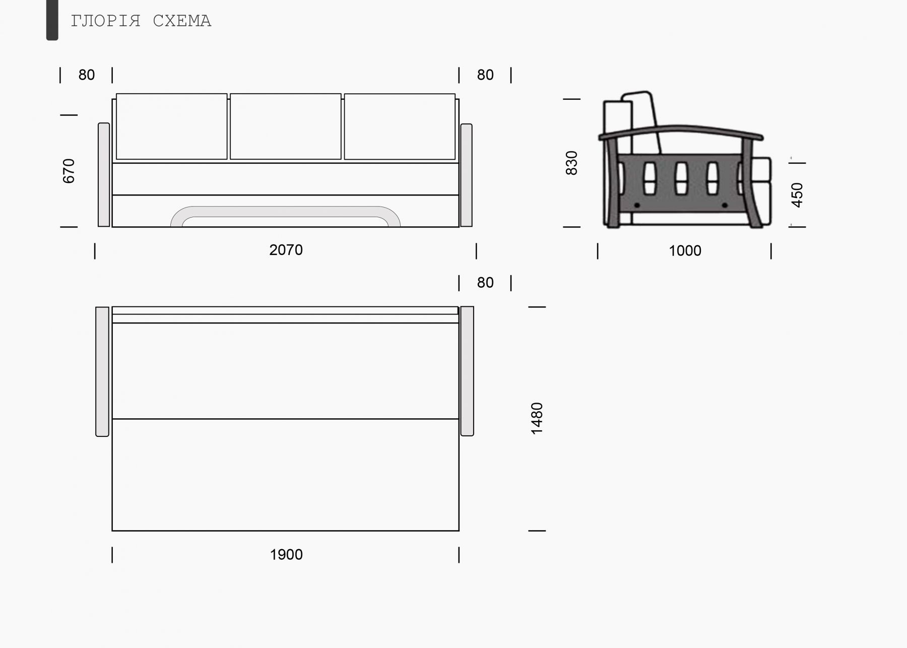 2070x820x1000 мм.;