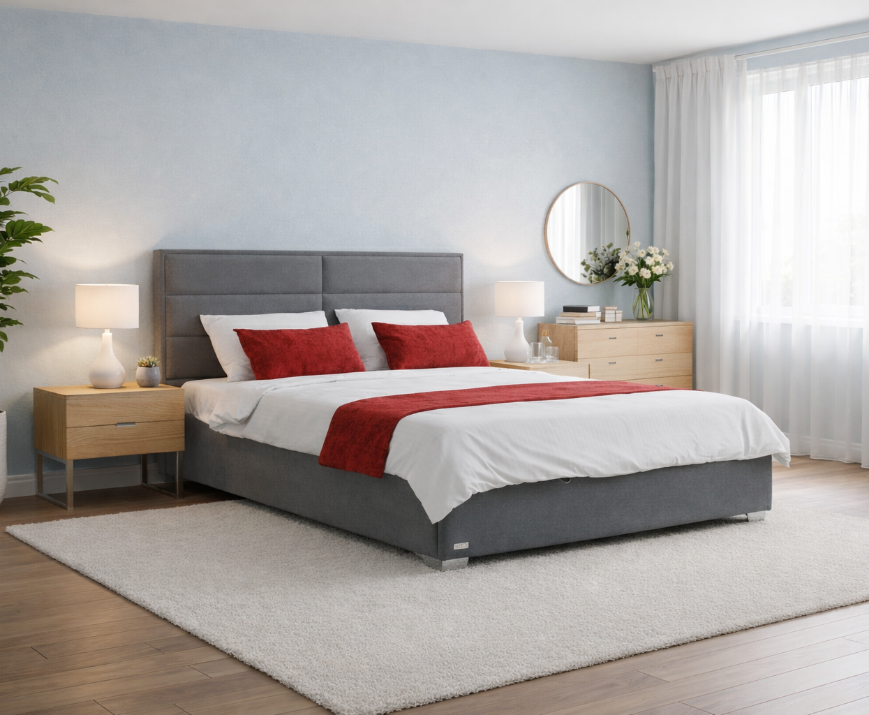 М’яка оббивка підсилює відчуття комфорту, а продумана композиція узголів’я робить ліжко центральним акцентом спальні. Дизайн виглядає дорого та впорядковано, не перевантажуючи інтер’єр.