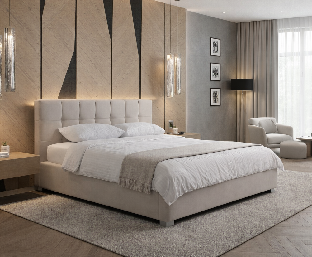 Ліжко Verona – це універсальне рішення для спальні, де поєднуються стриманий дизайн і візуальна виразність. М’яке узголів’я з геометричним поділом формує чіткий ритм і додає інтер’єру структурності, зберігаючи при цьому відчуття затишку.